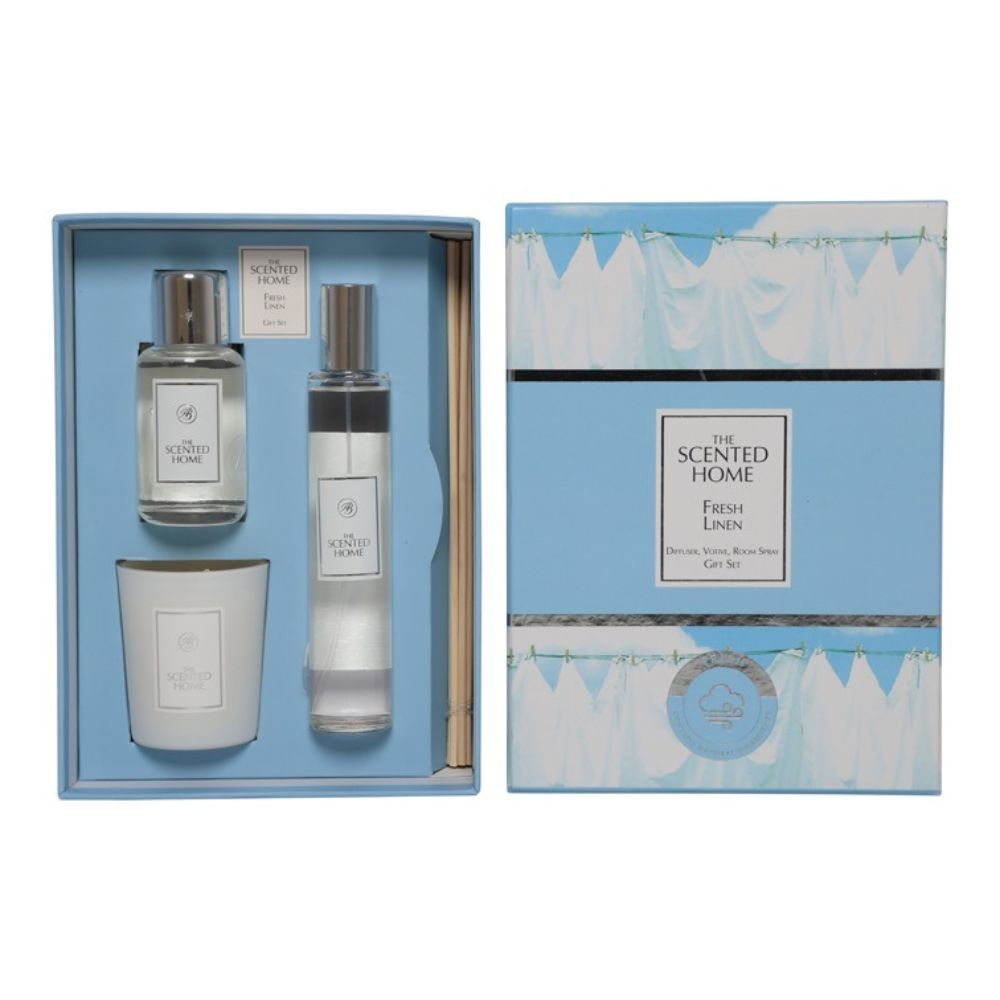 Ashleigh & Burwood Fresh Linen Gift Set Das Fresh Linen Gift Set eignet sich perfekt zum Verschenken! Es enthält eine Auswahl an luxuriösen Produkten, die Ihnen helfen, Ihr Zuhause mit einem herrlichen Duft zu versorgen: ein Mini-Raumspray, einen Mini-Duftstäbchen-Diffusor und eine Votivkerze.50 ml Duftstäbchen-Diffusor: genießen Sie bis zu 6 Wochen lang einen wunderbaren Duft70 g Votivkerze: hergestellt aus einer duftenden Sojawachsmischung für einen kräftigen Duft und mit einer Brenndauer von ca. 15 Stunden Verwenden Sie das Mini-Raumspray für einen schnellen Duftschub in jedem Raum Stilvoll verpackt und bereit zum Verschenken!