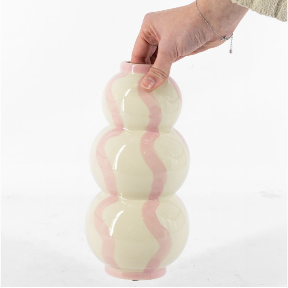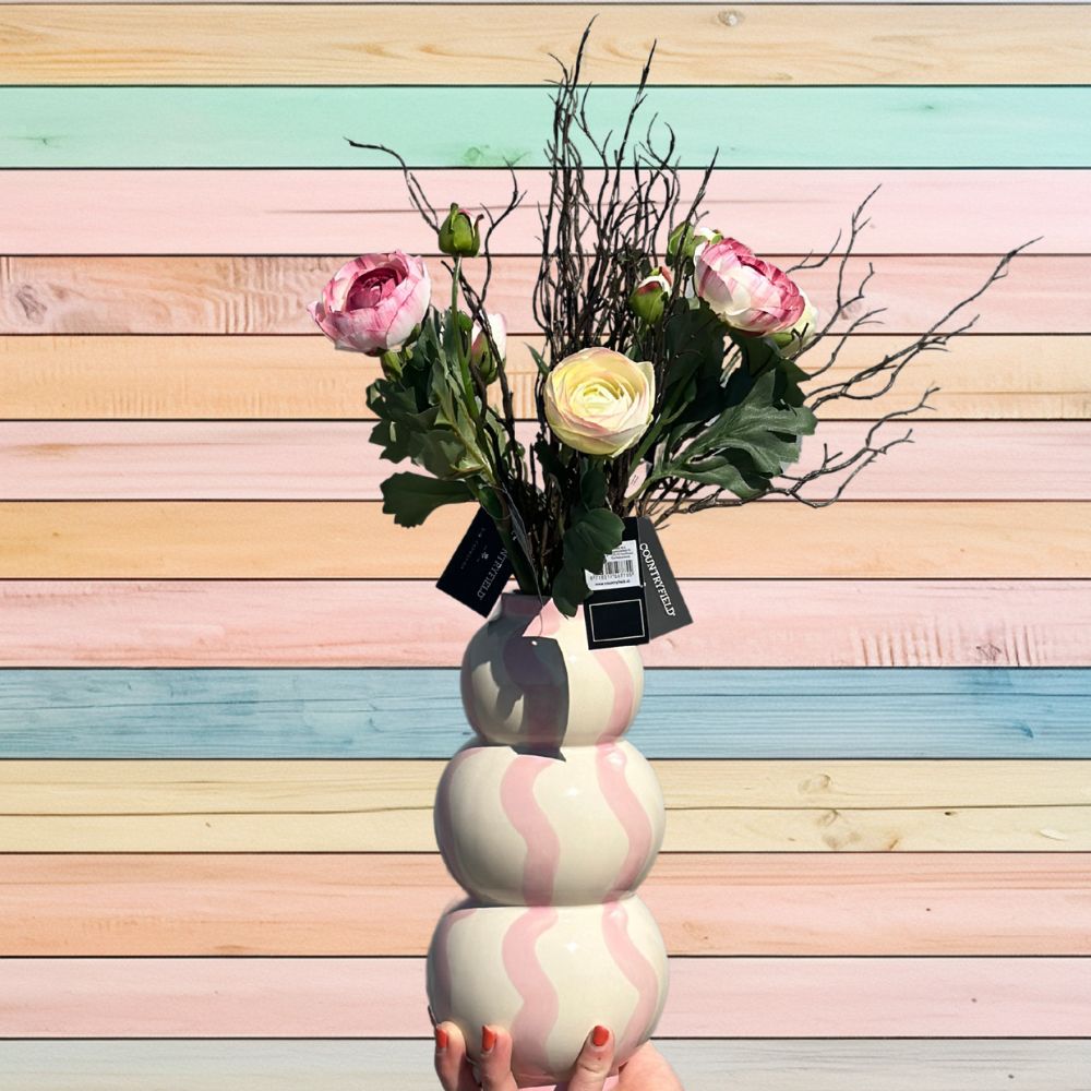 Eine schöne Vase mit rosa Streifen und 3 Ranunkeln in Rosa und 2 in Weiß. Und natürlich ein Bündel Myrica, um den Strauß zu vervollständigen.Schritt 1: Erwecken Sie Ihre Blumen zum Leben! Falten Sie die Blumen von links nach rechts und von vorne nach hinten, um einen spielerischen, lebendigen Effekt zu erzielen. So bekommt Ihr Strauß mehr Volumen und wirkt besonders fröhlich!Schritt 2: Schneiden Sie die Blumen zu ✂️ Mit einer scharfen Zange (die Sie selbst haben) können Sie die Blumen auf die richtige Länge für die von Ihnen gewählte Vase schneiden. So erhält Ihr Strauß genau die richtigen Proportionen!Schritt 3: Arrangieren Sie den Zweig in der Vase! Zeit, die Blumen in die Vase zu stellen! Da die Blumen Draht enthalten, kannst du sie auf alle möglichen Arten arrangieren. Lassen Sie Ihrer Kreativität freien Lauf und gestalten Sie etwas Schönes! ✨Bonus: Schick uns ein Foto deines schönen Blumenstraußes! Wir können es kaum erwarten, dein Ergebnis zu bewundern und auf unseren sozialen Netzwerken zu teilen! #YourFloralCreation Mit diesen einfachen Schritten können Sie einen wunderschönen Strauß kreieren, der Ihr Zuhause im Handumdrehen verschönern wird!