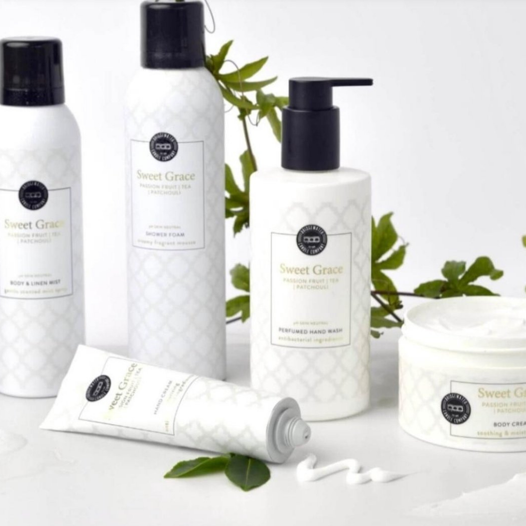 Bridgewater Candle Sweet Grace Luxury Body Gift setDieses Set besteht aus einer Handseife, einer Handcreme, einem schönen Duschschaum, einem Body&Linen Mist und einer pflegenden Körpercreme, verpackt in einer schönen Luxus-Geschenkbox.0% Paraben Jedes Mal, wenn Sie Sweet Grace riechen, werden Sie wieder von dem angenehmen leichten, frischen Duft mit würzigen Untertönen überrascht. Die Zutaten wie Passionsfrucht, Patchouli und frischer Tee machen diesen Duft einzigartig! Patchouli riecht wunderbar und wird schon seit Jahrzehnten in allen Arten von Seifen und Parfüms verwendet. Es ist ein Duft, der sich nicht schnell verflüchtigt.