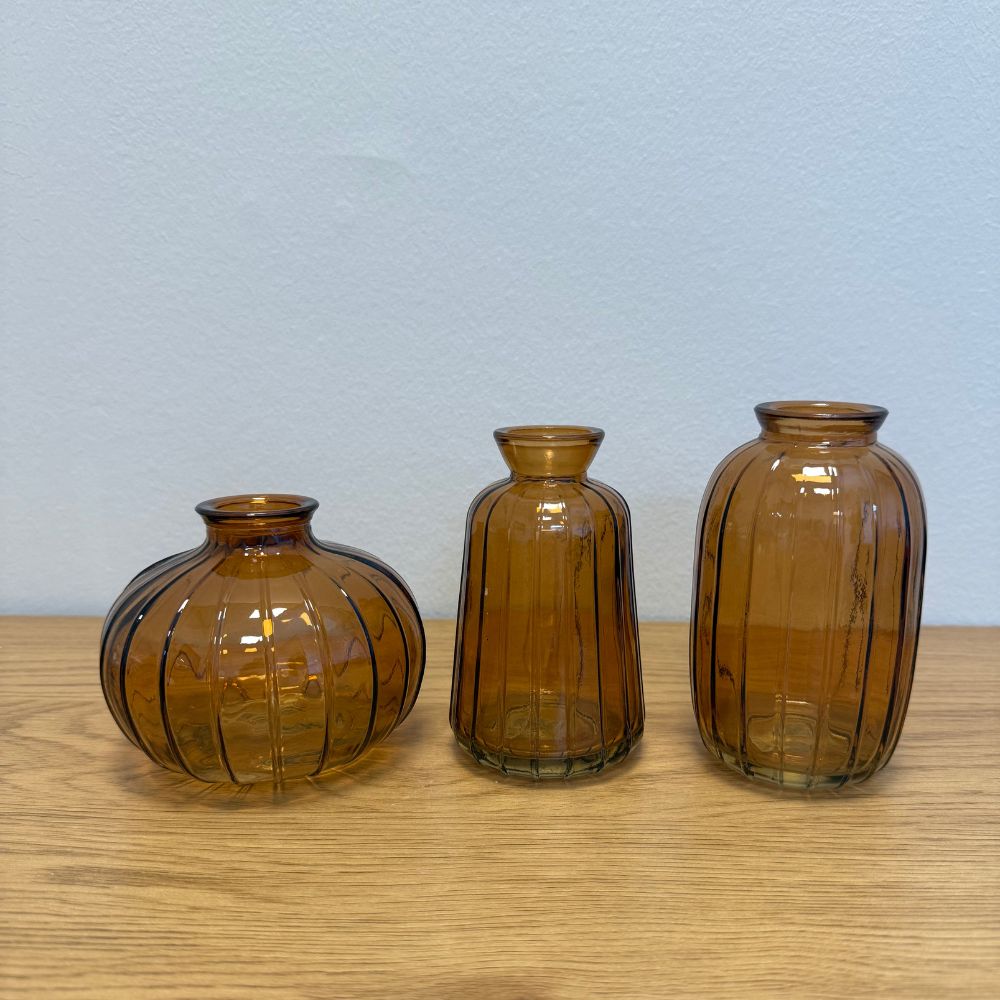 Bringen Sie Atmosphäre in Ihr Zuhause mit diesem Set aus drei stilvollen Glasvasen in Naturtönen. Jede Vase hat ein einzigartiges Design und eine praktische Größe – perfekt für eine kleine Blume, einen trocknenden Zweig oder als subtiler Akzent für einen Kerzenleuchter.