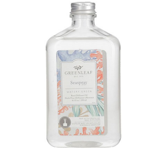 Greenleaf Diffuser Refil Oil SeasprayEine 250 ml Flasche gefüllt mit Öl, das Ihr Zuhause mit dem wunderbaren Duft Seaspray erfüllt. 250 ml reichen für 4 bis 5 Monate wunderbaren Duft in Ihrem Zuhause. Greenleaf Seaspray ist ein „kühler“ Duft. Neben Jasmin, Sandelholz und Moschus bringt er die Essenz frischer Meeresluft in Ihr Zuhause. Marke Greenleaf