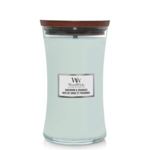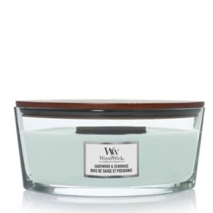 WoodWick Ellipse Sagewood & SeagrassNicht weniger als 50 Stunden des köstlichen Duftes Sagewood & Seagrass in Ihrem Zuhause.die Kerze hat den typischen Holzdocht und kommt in einem schönen Glas mit Holzdeckel.die Größe der Kerze ist 11,5 cm breit 9 cm hoch und 19,5 cm lang.Woodwick Sagewood & Seagrass ist eine luftige und dennoch komplexe Kombination aus knackigen Zitrusfrüchten, Ozean Mineralien und Noten von weißem Salbei.