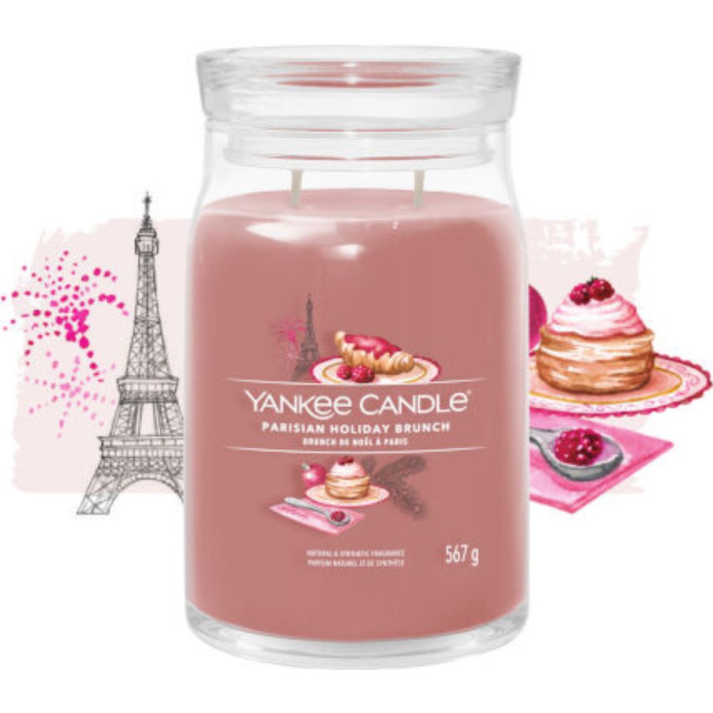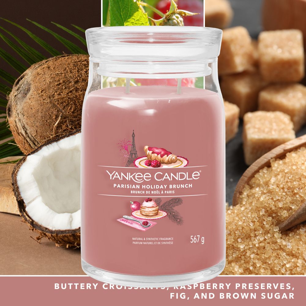 Yankee Candle Signature Medium Jar Parisian Holiday Brunch Das Signature Medium Jar hat eine erfrischende Interpretation unserer kultigen Jar-Form und wurde entwickelt, um die köstlichen Düfte von Yankee Candle zu genießen. Dieses Jar besteht aus einer weichen Sojawachsmischung, die ein sauberes, gleichmäßiges Abbrennen gewährleistet. Der Docht besteht aus 100 % Naturfasern, die gründlich getestet wurden, um ein bestmögliches Abbrennen zu gewährleisten. Das Medium Jar wiegt 368 Gramm, hat zwei Dochte und brennt 35 bis 50 Stunden. Yankee Candle Parisian Holiday Brunch misst 9,3 cm x 11,4 cm. Ein süßer, fruchtig-würziger Duft, der Sie in eine verträumte Bäckerei in Paris entführt, gefüllt mit duftenden Noten von Buttercroissants, Himbeermarmelade, Feigen und braunem Zucker.