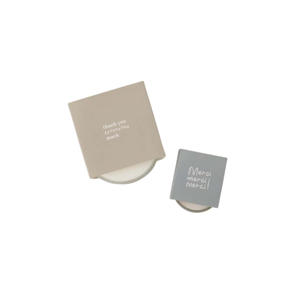 Sagen Sie es mit einer Kerze! Diese Zusss-Duftkerze in Weiß und Graublau strahlt Ruhe und Schlichtheit aus. Die Verpackung mit dem Text „Merci merci merci“ macht sie besonders persönlich – ideal, um jemandem auf süße und originelle Weise zu danken. ✨