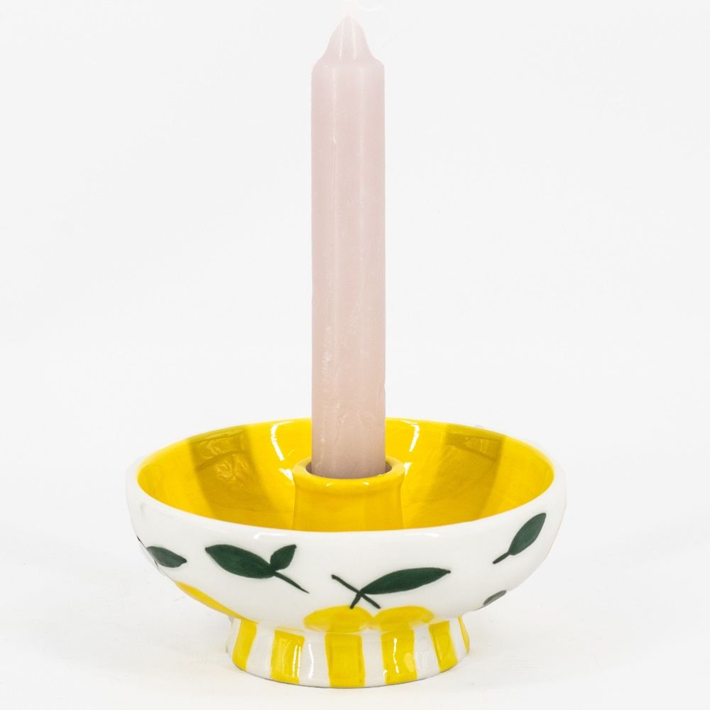 Homebound By KY Candlestick – Lemons ✨ Bringen Sie frische, sonnige Stimmung in Ihr Zuhause mit diesem Homebound By KY Candlestick im fröhlichen Zitronendesign! Der Kerzenständer aus hochwertiger Keramik mit den Maßen 11,7 x 11,7 x 5 cm ist nicht nur ein Stimmungsmacher, sondern auch ein auffälliges Deko-Objekt in Ihrem Zuhause. Stellen Sie eine Kerze auf und erzeugen Sie ein gemütliches, warmes Licht, das Ihren Raum erhellt. Dieser Kerzenständer eignet sich perfekt für den Esstisch, die Fensterbank oder als einzigartiges Geschenk für Liebhaber von frischem, verspieltem Design! ️