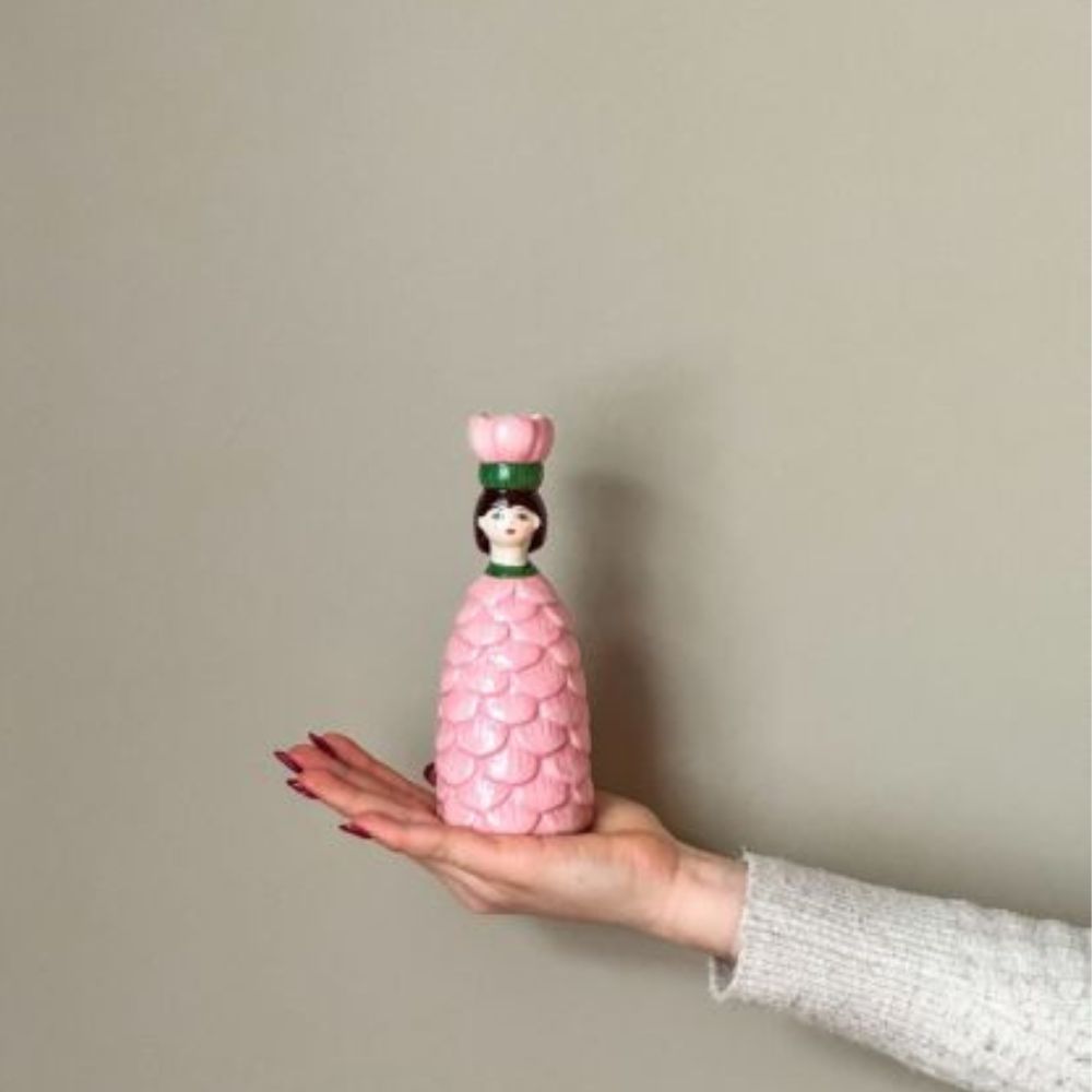 Was für ein fröhlicher Auftritt! Dieser verspielte Kerzenständer in Form einer Frau mit einer Blume im Haar bringt Farbe und Charakter in Ihr Zuhause. Der fröhliche rosa Farbton bringt sofort Farbe in Ihr Interieur – egal ob Sie ihn auf ein Regal, ein Sideboard oder einen Tisch stellen.