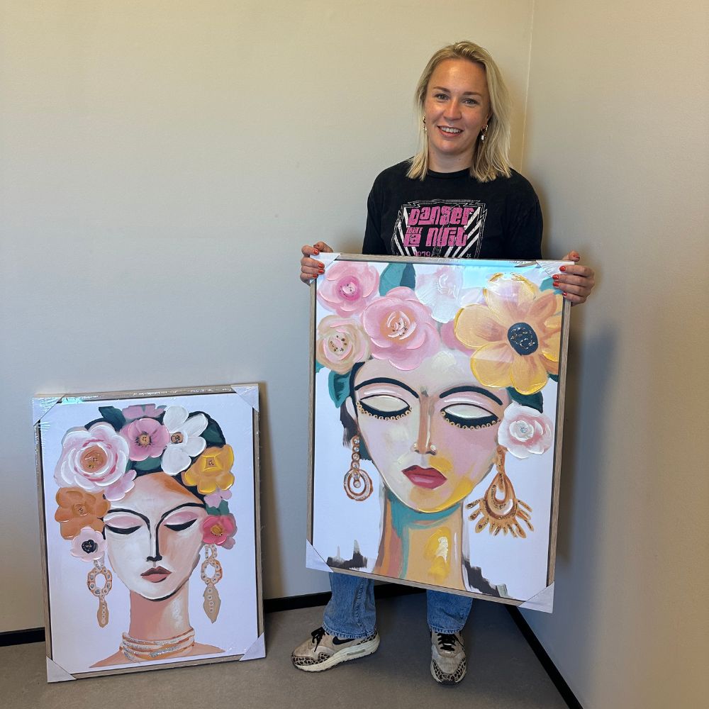 Homebound by KY Gemälde mit Rahmen – Woman Flower Wreath Dieses schöne Gemälde zeigt eine Frau, die einen Blumenkranz trägt. Die leuchtenden Farben erwecken das Kunstwerk zum Leben. Es ist eine zeitlose und charmante Ergänzung für Ihr Interieur, mit einem femininen und natürlichen Look, der Wärme und Eleganz ausstrahlt. Mit den Maßen 60 x 80 x 3,8 cm ist dieses Gemälde groß genug, um ein Statement zu setzen, aber subtil genug, um in jeden Raum zu passen. Bringen Sie einen Hauch von Natur und Schönheit in Ihr Zuhause mit diesem besonderen Kunstwerk! ️