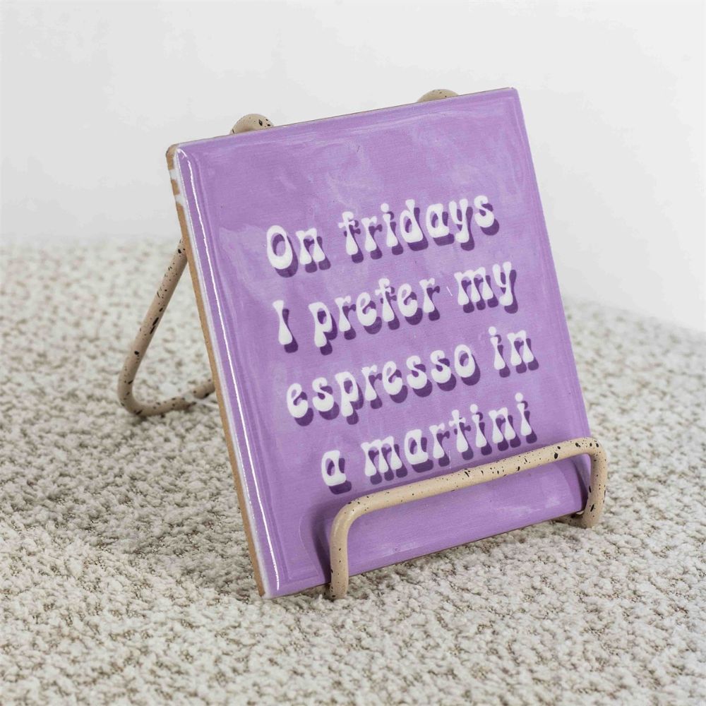 Diese stilvolle Fliese mit schlichtem schwarzem Text ist das perfekte Geschenk für einen Cocktail-Liebhaber oder eine fröhliche Erinnerung an den Freitagnachmittag in der eigenen Küche oder im Büro.