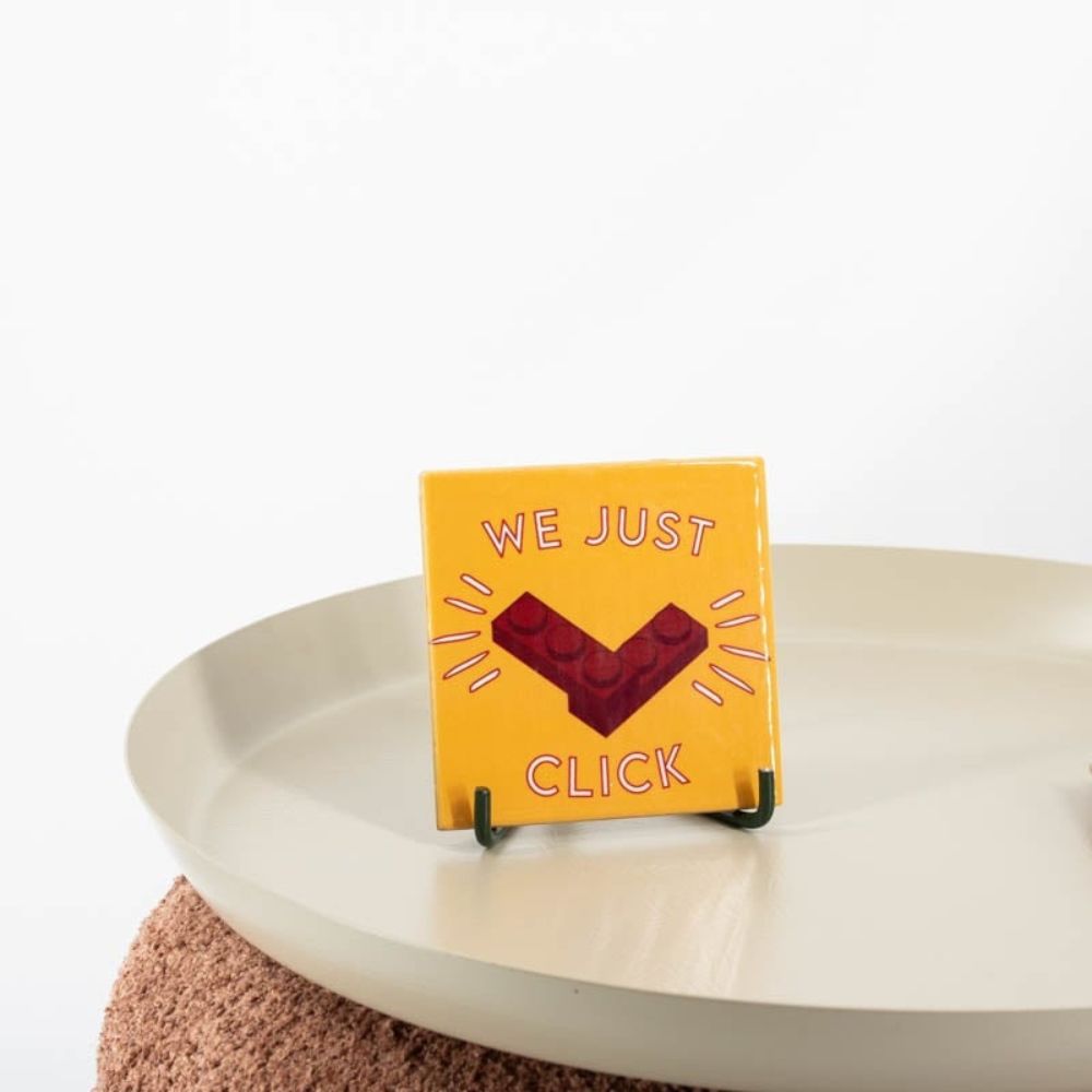 Wie süß ist diese Fliese mit dem Text We Click? Wie Legosteine, die perfekt zusammenpassen, feiern Sie mit dieser fröhlichen Fliese Freundschaft, Liebe oder einen guten Klick. Ein originelles Geschenk für die beste Freundin, den Partner oder Kollegen – oder einfach für sich selbst.
