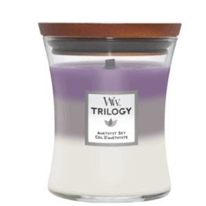 Die WoodWick Trilogy mit dem Duft Amethyst Sky ist in 3 verschiedenen Varianten erhältlich. Sie können sich für die große Variante in der Sanduhrflasche entscheiden. Diese Kerze brennt sehr lange, nicht weniger als 130 Stunden (!), was sie zu einem echten Dauerbrenner in vielen Haushalten macht. Wenn die Kerze zur Neige geht, stürzen sich die Leute darauf, diese Variante erneut zu kaufen. Die Kerze ist auch in einer mittleren Variante erhältlich, die etwas kürzer brennt.