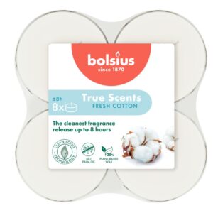 Die frische weiße Bolsius Fresh Cotton-Duftkerze im Klarglas brennt bis zu 45 Stunden lang und verbreitet den sauberen, weichen Duft frisch gewaschener Laken.