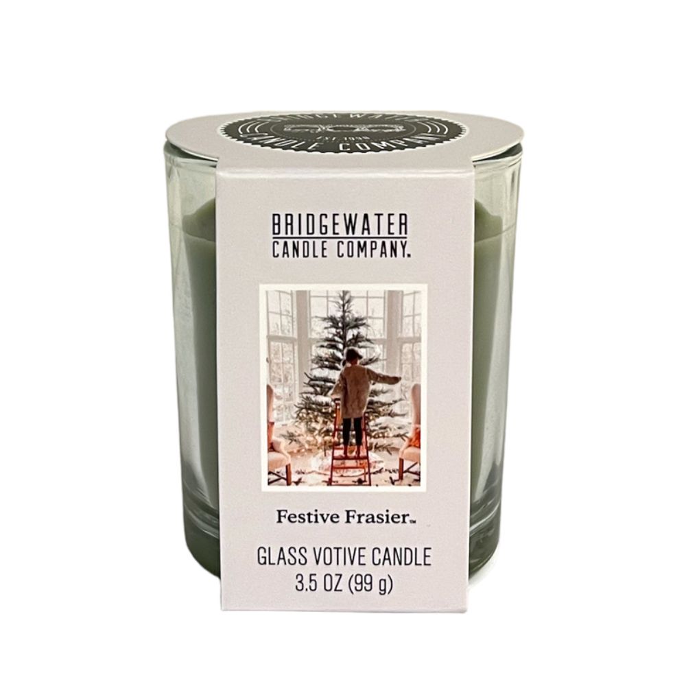 Bridgewater Votiv-/DuftkerzeFestive Frasier. Die Bridgewater Candle Duftkerzen werden aus natürlichem Soja hergestellt, was eine lange und saubere Brenndauer gewährleistet. Die Bridgewater Candle Duftkerzen haben eine Brenndauer von 30 Stunden.