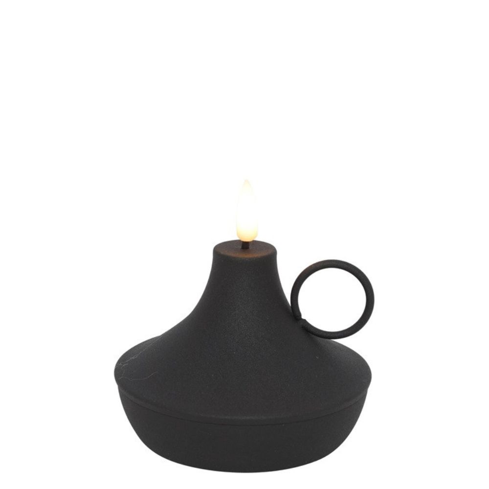 Stilvolle LED-Kerze in Form einer klassischen Öllampe. Die mattschwarze Optik und die 3D-Flammen-LED sorgen für ein warmes, realistisch flackerndes Licht. Sicher, einfach und mit 6-Stunden-Timer.