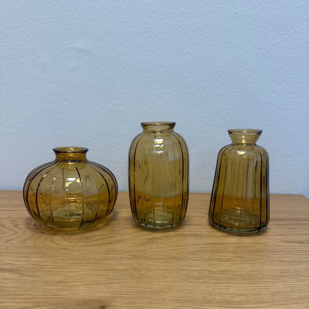 Bringen Sie Atmosphäre in Ihr Zuhause mit diesem Set aus drei stilvollen Glasvasen in Naturtönen. Jede Vase hat ein einzigartiges Design und eine praktische Größe – perfekt für eine kleine Blume, einen trocknenden Zweig oder als subtiler Akzent für einen Kerzenleuchter.